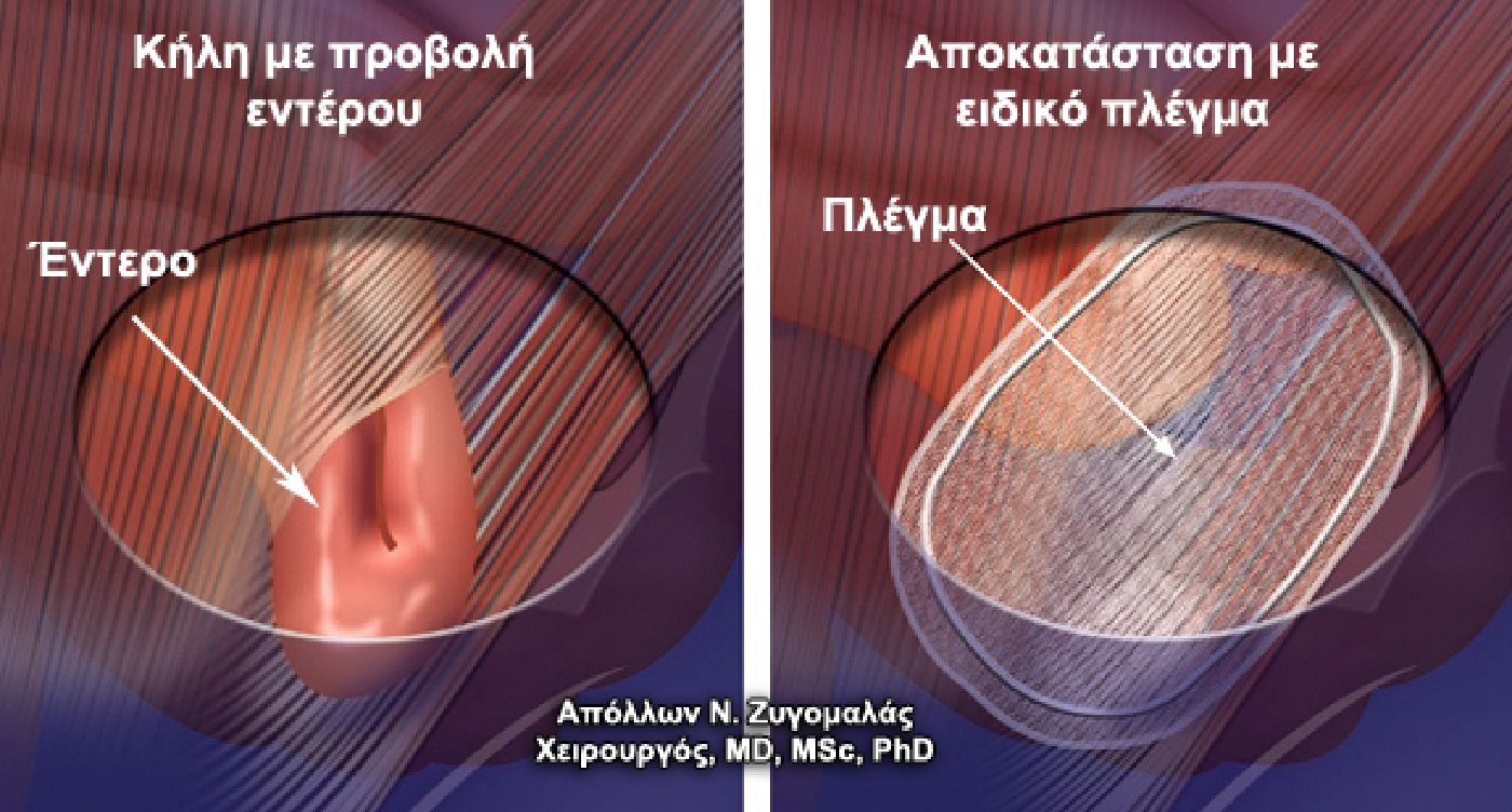 Το χειρουργείο έχει σκοπό να ανατάξει το σπλάχνο που προβάλει, να αποκαταστήσει τη βλάβη στο κοιλιακό τοίχωμα και ταυτόχρονα να το ενδυναμώσει με τη βοήθεια ειδικών πλεγμάτων ώστε να μειωθεί η πιθανότητα υποτροπής.
